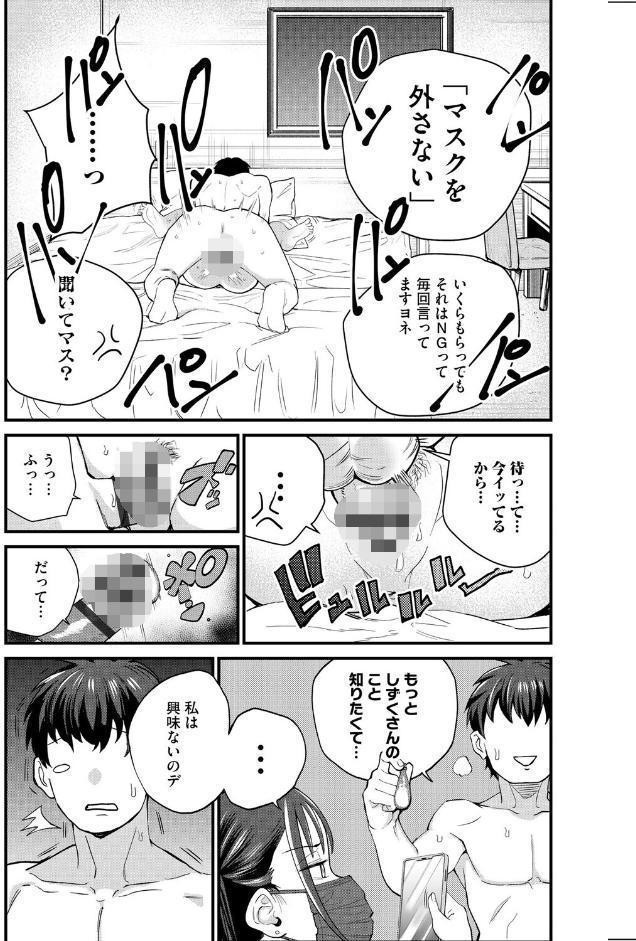 パパ活で出会った地雷系女子・しずくさん。 本番はもちろん、お金次第で生ナカだってOKしてくれるNGなし娘――と思っていたが、マスクだけは絶対に外してくれない。 お金の問題ではないようだし、マスクのことを聞くだけでも超絶不機嫌になってしまうしずくさん。 素顔みたい…隠されるほど見てみたい……まだ見ぬ素顔を夢見ていたら、跳ねた精液がよりによってしずくさんのマスクに――――!