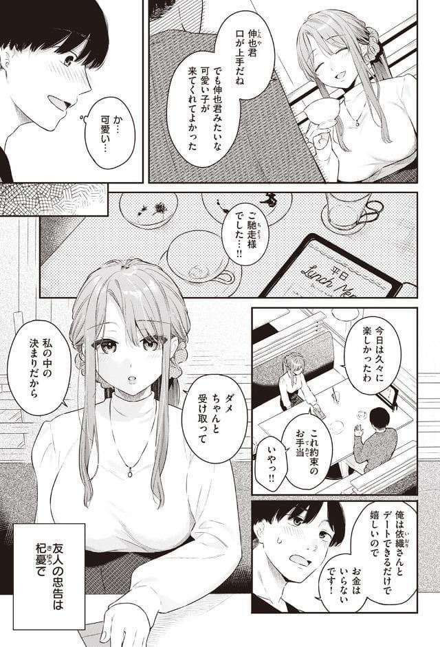 「私と……試してみる?」 寂しさからママ活相手を探していた依織(いおり)は、マッチングアプリを通じて年下の学生・伸也(しんや)と出会う。 当初はカラダの関係もないお話相手だったが、伸也の真っ直ぐな想いと恋人のように接してくれることに惹かれ徐々に依織もガードを緩めていく。 そしてある日、伸也がまだ女性に不慣れだということを知って……?