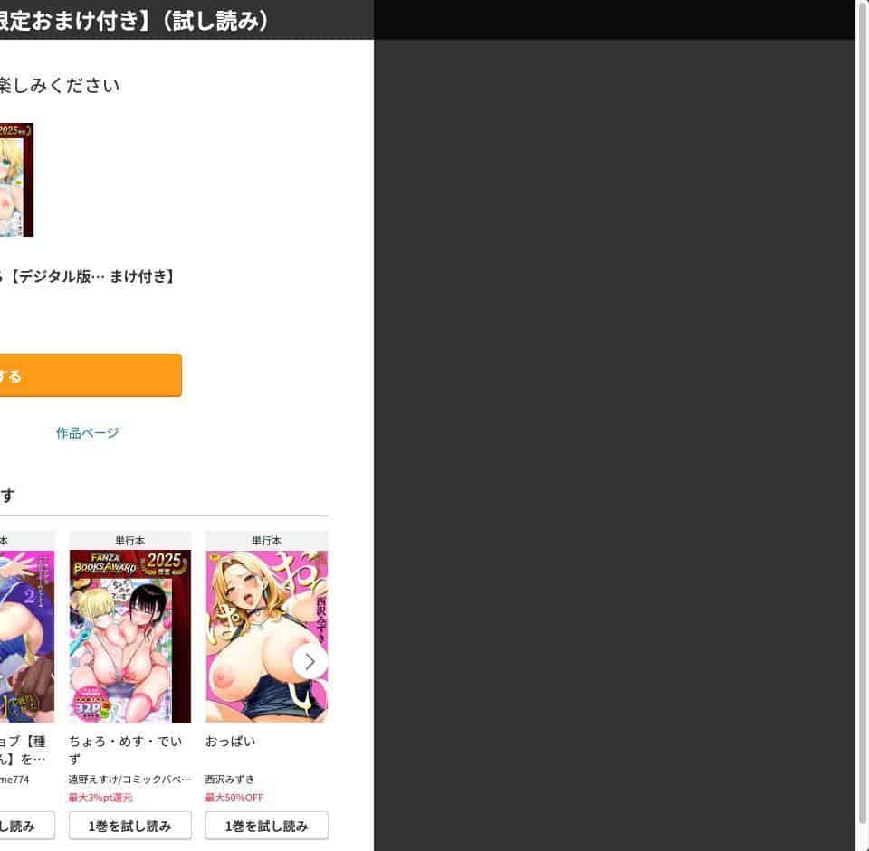 結論:FANZAで間違いなし。「昔はDLsiteの方がモザ薄」なんて声もあったけど、今はほぼ同じ画質。それなら大手でセール頻発&使いやすいFANZAが圧勝!今すぐ無料でエロ漫画を読む。